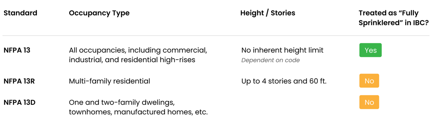 Figure 1: Comparison of NFPA 13, NFPA 13R, and NFPA 13D by occupancy type, height limitations, and IBC “fully sprinklered” status.