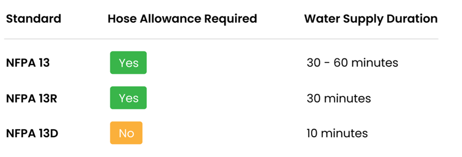 Figure 2: Comparison of NFPA 13, NFPA 13R, and NFPA 13D requirements for hose allowances and water supply duration.
